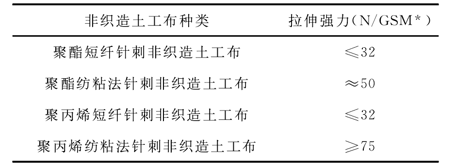 短纖針刺非織造土工布強力明顯低于紡粘法針刺非織造土工布,聚丙烯紡粘法針刺非織造土工布強力明顯高于聚酯紡粘法針刺非織造土工布。